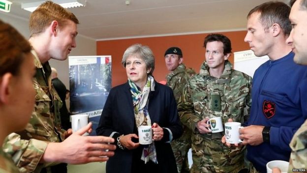 Addressing British troops stationed in the the country earlier, Mrs May said the UK was not leaving Europe and was "unconditionally committed to maintaining Europe's security".
